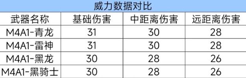 在威力方面,M4A1-青龙与M4A1-雷神相同,比M4A1-黑龙以及M4A1-黑骑士要高出一些,更高的31点伤害可以为手持玩家带来更好的击杀概率,在对局中的实用性举足轻重,以下即为整体威力数据对比。