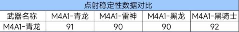 M4A1-青龙的点射稳定性有了明显的优化,点射稳定性达到91点,比雷神与黑龙略高一些,这也就保证对局中远距离下M4A1-青龙在点射时的准度,与敌方对枪也根本不虚,手感也会进一步提高,以下即为点射数据对比。