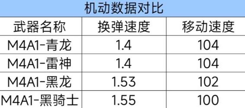 在与机动性挂钩的换弹速度以及移动速度上,M4A1-青龙的换弹速度达到了1.4s,与雷神持平,远高于黑骑士以及黑龙,而移动速度更是达到104,强大的机动性为我们在对局中抢点、回防时更有优势性,以下即为详细数据对比。