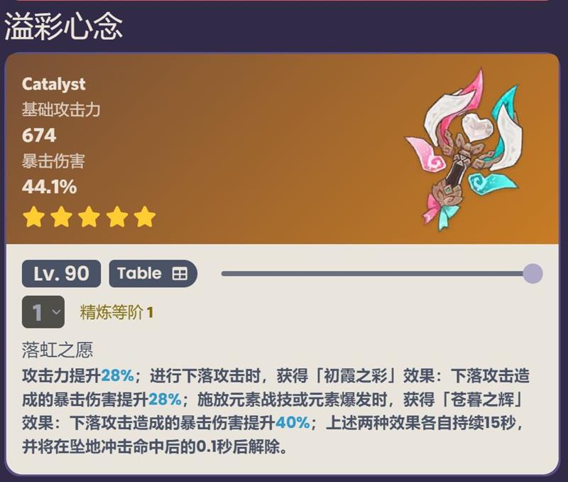 溢彩心念:溢彩心念是瓦雷莎的专属武器,其副属性为暴击伤害,能够有效减轻她在装备圣遗物方面的压力。该武器的特效“落虹之愿”能够显著提升瓦雷莎的下落攻击暴击伤害。具体来说,施放元素战技或元素爆发后,下落攻击的暴击伤害会额外提升40%至80%,持续15秒。这与瓦雷莎的技能机制完美契合,尤其是在她进入炽热激情状态后,下落攻击的伤害会进一步提升。因此,溢彩心念是瓦雷莎的首选武器,能够最大化她的输出能力。