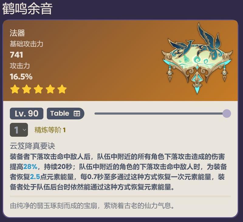 鹤鸣余音:这把法器是闲云的专武,被动技能“云笈降真要诀”与瓦雷莎的输出方式十分契合。瓦雷莎的强化下落攻击是其主要输出手段,而该武器能使装备者下落攻击命中敌人后,提升队伍中附近角色下落攻击的伤害,并且还能为装备者恢复元素能量。这不仅能够增强瓦雷莎自身的输出能力,还能间接提升队伍整体的下落攻击伤害,同时解决了瓦雷莎在输出过程中可能面临的元素能量不足的问题,使她能够更频繁地使用元素爆发进入炽热激情状态,进一步提升输出效率。不过要注意的是使用这个的话,需要圣遗物多搞点双爆出来。