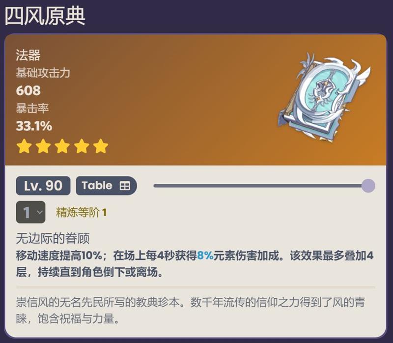 四风原典:其被动技能“无边际的眷顾”能够提升移动速度,并且在场上每4秒获得元素伤害加成,最多可叠加4层。瓦雷莎的下落攻击属于雷元素伤害,能够从该武器提供的元素伤害加成中受益。随着战斗时间的延长,该武器的被动技能能够逐渐叠加,为瓦雷莎提供持续的输出提升,使其在长时间的战斗中能够保持较高的伤害输出。此外,提升的移动速度也有助于瓦雷莎在战场上更好地调整位置,进行下落攻击等操作。