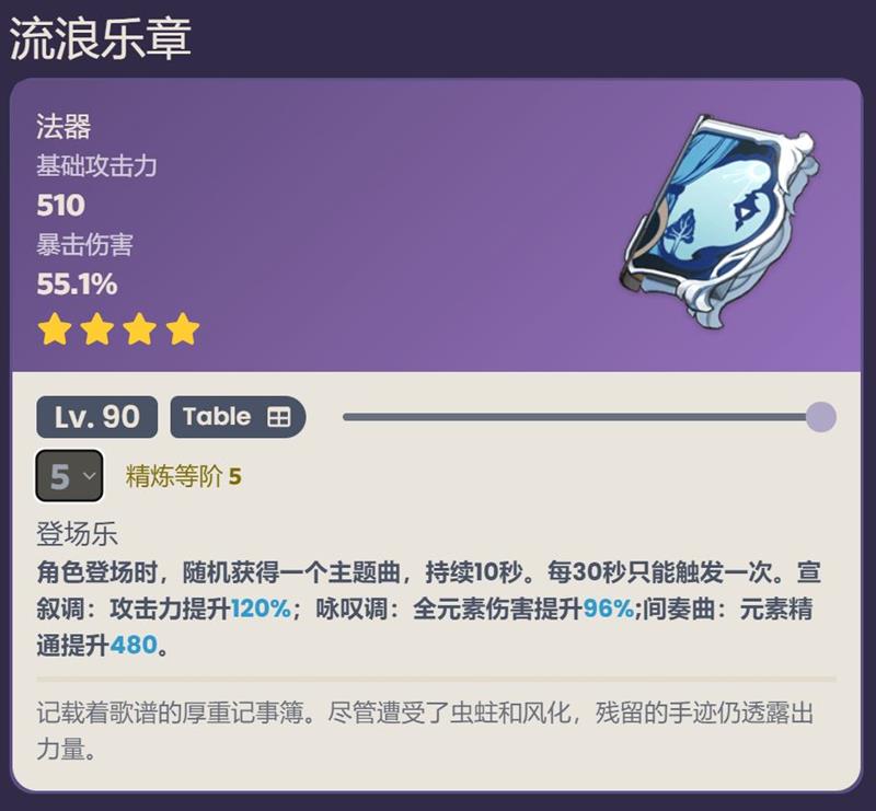 流浪乐章:流浪乐章的被动技能“登场乐”能够使角色登场时随机获得一个主题曲,提升攻击力、全元素伤害或元素精通。这对于瓦雷莎的输出能力提升非常有帮助,尤其是在她进入炽热激情状态后,能够进一步提升她的伤害。此外,流浪乐章的基础攻击力较高,能够满足瓦雷莎对于攻击力的需求。流浪乐章可以通过祈愿获得,其属性和被动技能与瓦雷莎的技能机制较为契合,是一个适合她的武器选择。