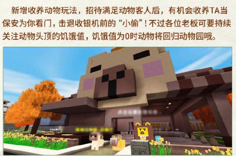 新增收养动物玩法,招待满足动物客人后,有机会收养TA当保安为你看门,击退收银机前的“小愉”!不过各位老板可要持续关注动物头顶的饥饿值,饥饿值为0时动物将回归动物园哦。