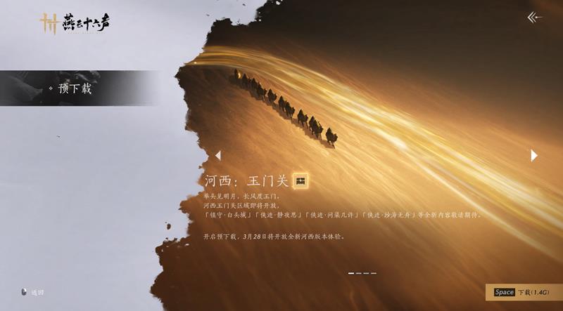 《燕云十六声》1.6.5版本更新即将来袭,游戏江湖迎来诸多新变化。2025年3月22日,游戏将正式开启河西区域首个篇章「玉门关」的预下载功能,游侠们可从游戏主界面进入提前下载相关资源,移动端更新大小预计在1 - 2G之间,PC端预期在5 - 10G之间。完成预下载的游侠将获得188长鸣玉作为奖励。