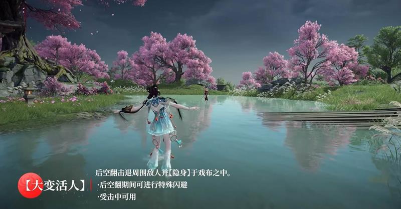 大变活人:蓝梦后空翻击退周围敌人并隐身于戏布之中。后空翻期间可按Shift闪避(不耗精力),并略微延长隐身时间,该技能受击时也可使用。