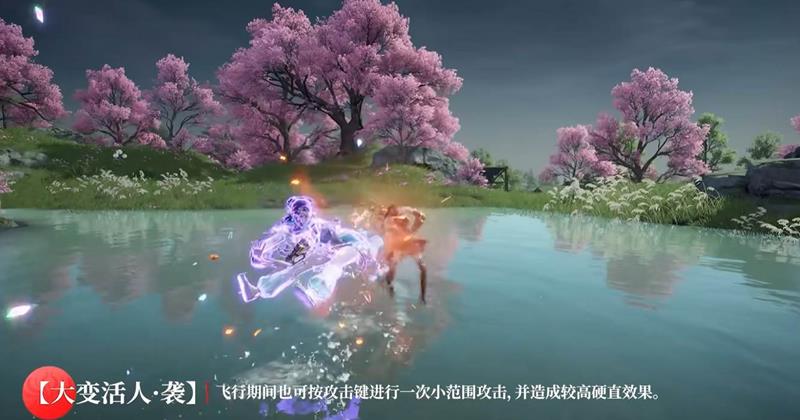 飞行期间可按鼠标左键释放大范围伤害招式,飞行结束时也会自动释放。飞行期间按Shift可提前脱离戏布,并隐身0.3秒,此时按鼠标左键可进行一次小范围攻击,造成较高硬直效果。