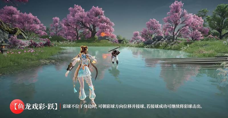 鱼龙彩戏:蓝梦击退周围敌人,以幻身法跃上戏布并释放弹射彩球。彩球会在场景和敌人中飞行和反弹,可攻击敌人并回复自身。