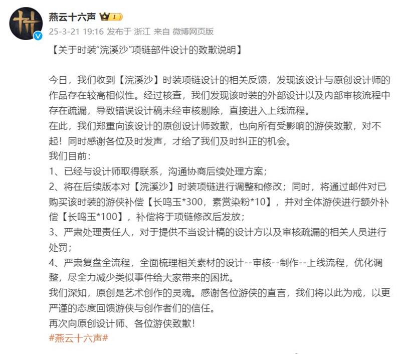 针对这一问题,官方已采取多项措施。首先,官方已经与原创设计师取得联系,并正在沟通协商后续处理方案。其次,官方将在后续版本中对“浣溪沙”时装项链进行调整和修改。同时,为了补偿已购买该时装的游侠,官方将通过邮件发放补偿,内容包括长鸣玉300个、素赏染粉10个。