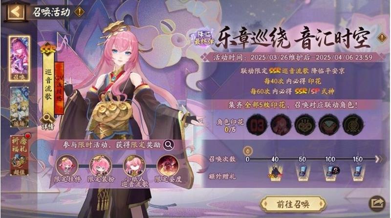 本次召唤活动分为“乐章巡绕,音汇时空(降临)”和“乐章巡绕,音汇时空(返场)”两个部分。活动时间为3月26日维护后至4月6日23:59,详细福利及规则请阴阳师大人于活动内查看。