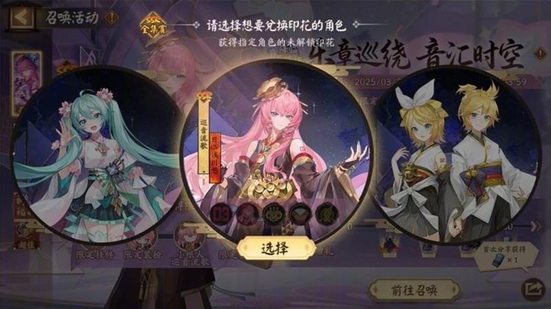 而在“乐章巡绕,音汇时空(返场)”中,往期联动SSR初音未来、SSR镜音铃·连将限时回归,大人可以选择初音未来或镜音铃·连作为定向角色进行召唤,有一定概率获得1枚定向角色印花。