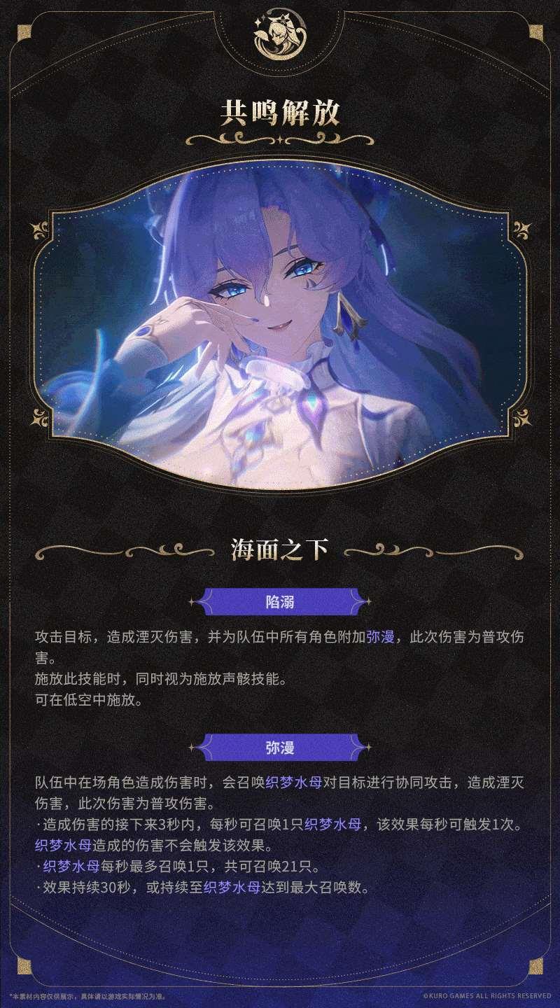 - 海面之下:陷溺,攻击目标,造成湮灭伤害,并为队伍中所有角色附加弥漫,此次伤害为普攻伤害。施放此技能时,同时视为施放声骸技能。可在低空中施放。