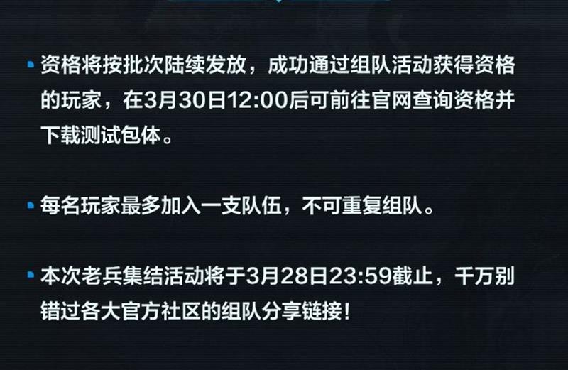 资格将按批次陆续发放,成功通过组队活动获得资格的玩家,在3月30日12:00后可前往官网查询资格并下载测试包体。