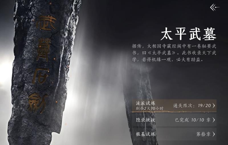 太平武墓-流派试炼:进度及奖励重置,通关限次重置为5次,限时徽章和侠名会重置为待获取状态;「悟道璞」剩余部分不会重置,新赛季将刷新获取上限。