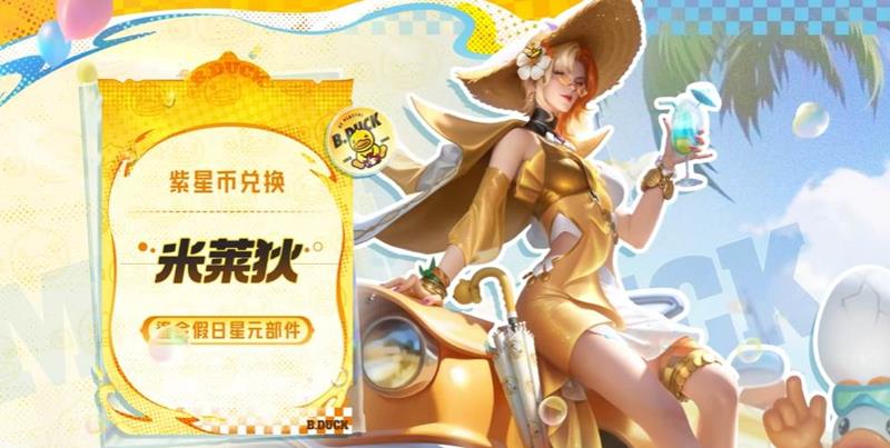 王者荣耀在今天正式官宣,米莱狄完美假期星元皮肤将开启紫星币限时兑换,!米莱狄身着小黄鸭主题的沙滩泳衣装扮,将活泼可爱的小黄鸭元素与清爽的泳衣设计巧妙融合,俏皮时尚,展现出独特的夏日风情。