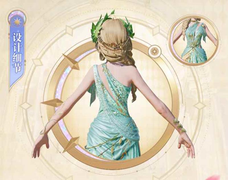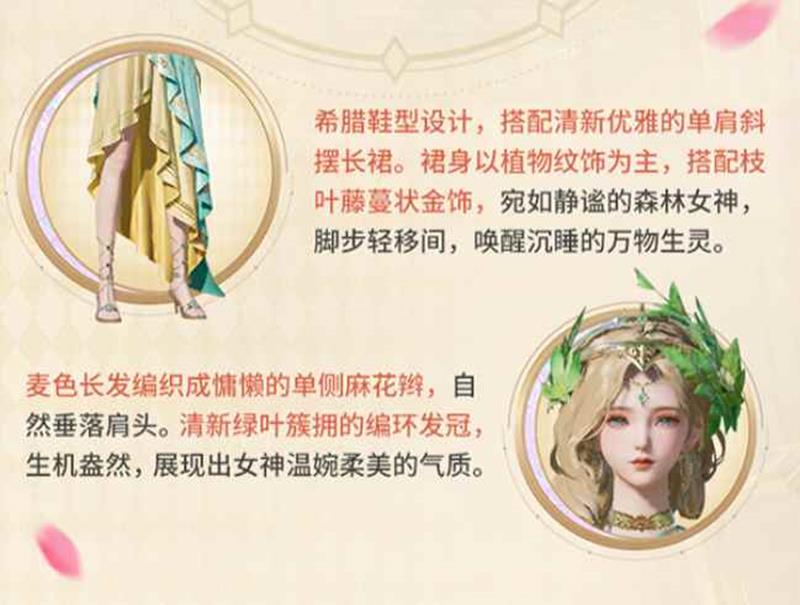 麦色长发编织成慵懒的单侧麻花辫,自然垂落肩头。清新绿叶簇拥的编环发冠生机盎然,展现出女神温婉柔美的气质。