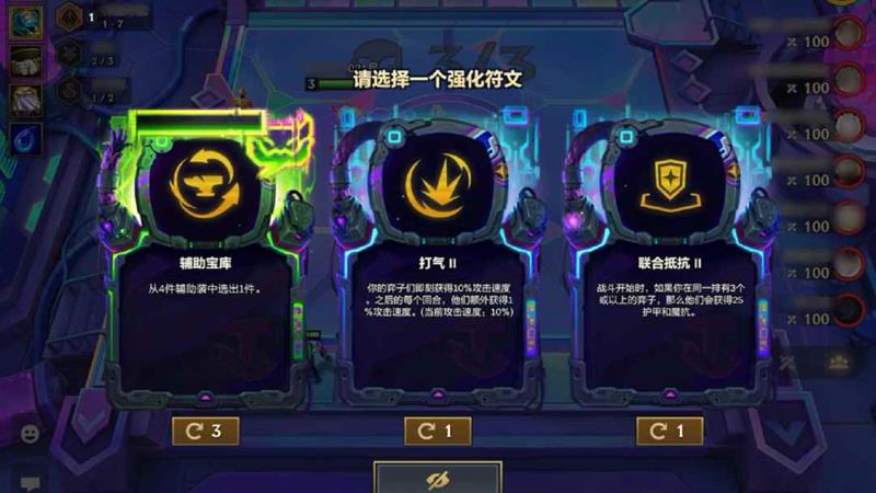 1v2强化符文:选择一个较强的黄金强化符文,或选择两个可能有协同效果,但强度较弱的白银强化符文。