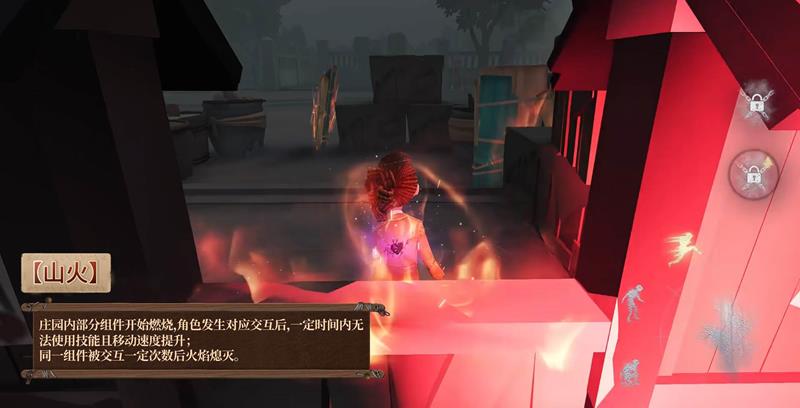 其中,【山火】会使庄园内部分组件开始燃烧,角色在发生对应交互后,会在一定时间内无法使用技能,但移动速度会提升,且同一组件被交互一定次数后火焰会熄灭。
