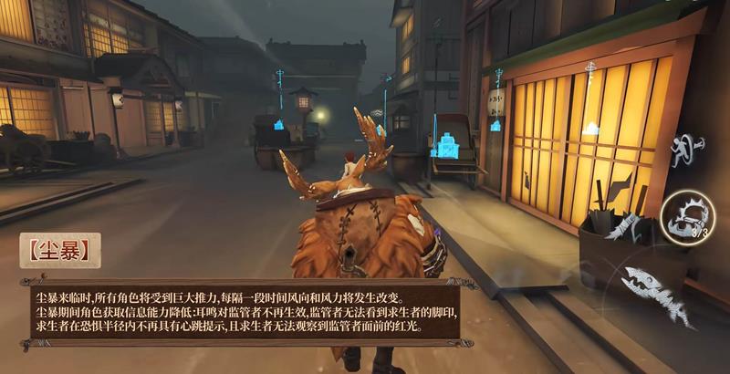 【尘暴】来临时,所有角色将受到巨大推力,每隔一段时间风向和风力会发生改变,同时角色获取信息的能力也会降低,耳鸣对监管者不再生效,监管者无法看到求生者的脚印,求生者在恐惧半径内不再具有心跳提示,也无法观察到监管者面前的红光。