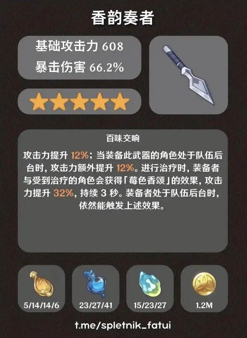 爱可菲作为5.6版本卡池新角色,其专武也已曝光。这把五星长柄武器基础攻击力608,暴击伤害加成66.2%,武器效果可使角色攻击力提升12%,当角色处于后台时,攻击力额外提升12%,治疗时装备者和被治疗角色都会获得攻击提升32%的增益效果,这是第一把具备辅助能力的双爆五星长柄武器。
