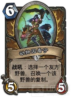 这是一张可以直接看出来非常强力的单卡,它本身是一个5费身板,所以理论上只要能够召唤到1费以上的野兽随从复制都算赚,如果能够做到5费潜行老虎,6费准时上它的话,甚至能够一次性在场上制造三只5/5的庞然大物。