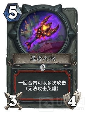 武器牌具有法术牌的即时性优势,同时又具有随从牌的延时性优势,但它也有明显的缺点:需要接连不断地消耗英雄血量,随着比赛进行,价值渐渐下降。像盗贼、猎人等没有回复的职业,极有可能掏出武器解着解着场就死了。但战士却不一样,首先其英雄技能本身就可以回血,其次还有一大堆可以配合加护甲的牌,因此我们定义战士对于卖血是有一个良好的接受度的。在这个前提下,愚者之灾就显得很厉害了。