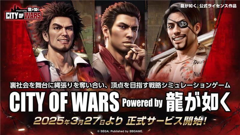 《如龙》官方授权手游《City of Wars Powered by 如龙》于2025年3月27日正式开服。这款由BBGame开发的游戏是《如龙》IP的首部手游作品,以经典游戏《如龙》为题材,是一款战争策略类游戏。
