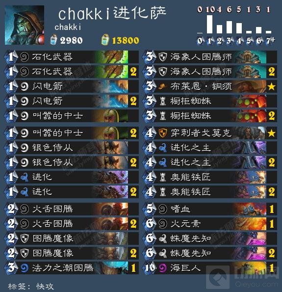 在早些时候LG chakki丢出了一套进化萨并称之为bad cards。我是不能认同的。首先他错误的定位了进化萨,并选择了很多不适合套牌的单卡,强行把自己桎梏在速攻体系之中。
