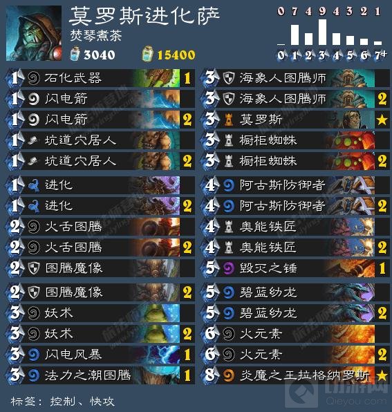 回到我发的这套莫罗斯进化萨,我用这套牌在天梯中对抗战士和德鲁伊非常好打,而遇到的大部分猎人我也能保持报胜率。对战