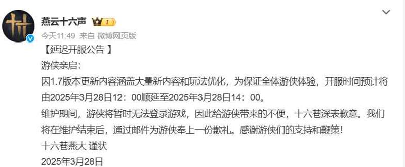 先前我们报道过,燕云十六声原计划3月28日中午12.00正式开服的更新遭遇两次延时,第一次从中午12.00延迟至下午2点。但在不久后又迎来第二次开服延时。目前游戏还未正式开服。而官方表示则需要延时至17.00。