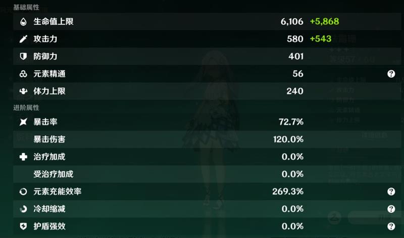 珐露珊的毕业面板要求250%以上的充能效率,在此基础上通过堆叠暴击和爆伤用来弥补伤害。