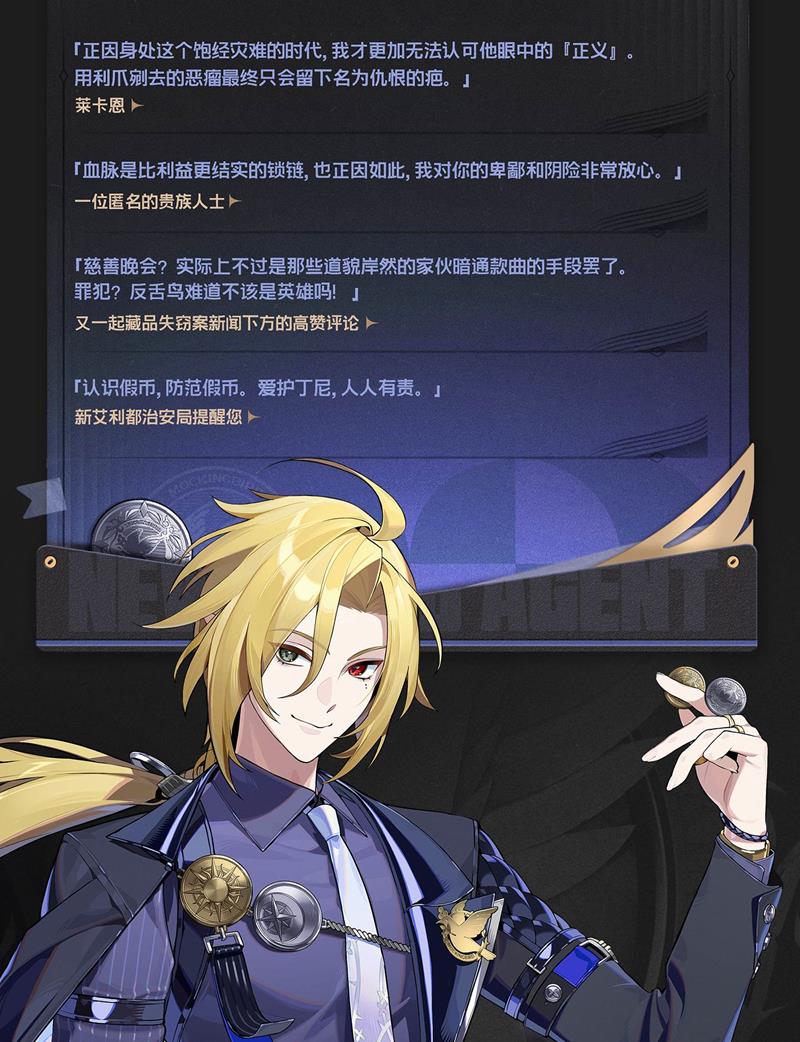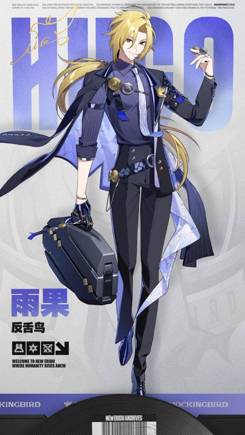 雨果是游戏中最早露面的[反舌鸟]成员之一,拥有金发异瞳,典型的吸血鬼形象,对外身份是一位收藏家,但实际上他所收藏的或许是其他人的宝贝。他手中时常拎着一个提包,从提包的机械结构来看,大概率是可以折叠变成武器的。