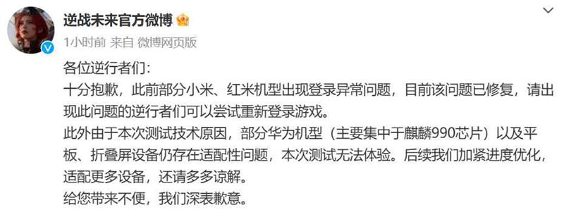 十分抱歉,此前部分小米、红米机型出现登录异常问题,目前该问题已修复,请出现此问题的逆行者们可以尝试重新登录游戏。