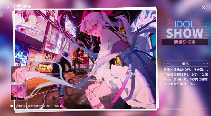 偶像SHOW的初级效果是打击系、力场系伤害提升3%,当装备者产生治疗时,8秒内伤害加成效果额外提升50%。满级效果则更为显著,打击系、力场系伤害提升7.5%,治疗时的伤害加成效果额外提升50%。
