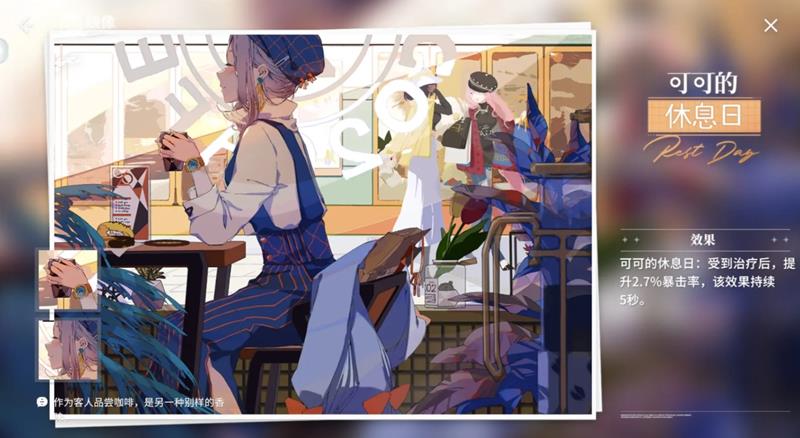 可可的休息日的初级效果是在受到治疗后,提升2.7%暴击率,持续5秒。满级效果则是受到治疗后,提升6.75%暴击率,持续5秒。