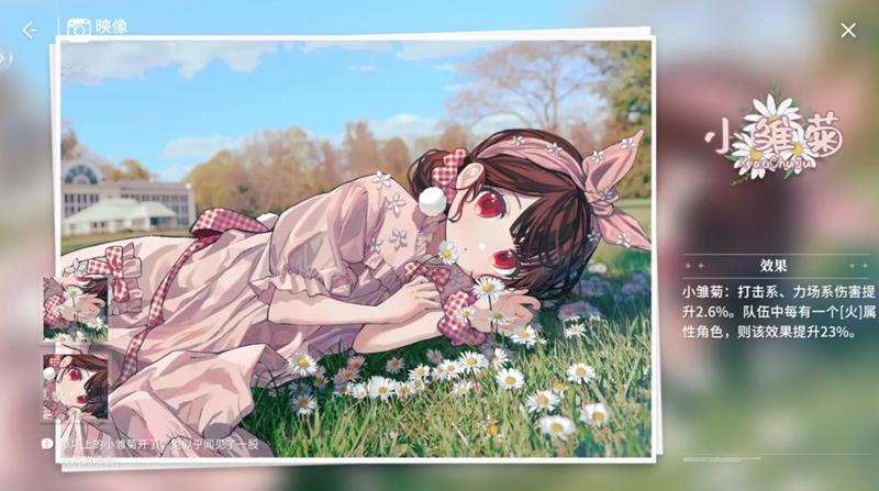 小雏菊的初级效果是打击系、力场系伤害提升2.6%,队伍中每有一个火属性角色,则该效果提升23%。满级效果是打击系、力场系伤害提升6.4%,队伍中每有一个火属性角色,则该效果提升23%。浮水的初级效果是造成治疗时,自身获得6.6%攻击力提升,持续6秒。满级效果则是造成治疗时,自身获得16.6%攻击力提升,持续6秒。