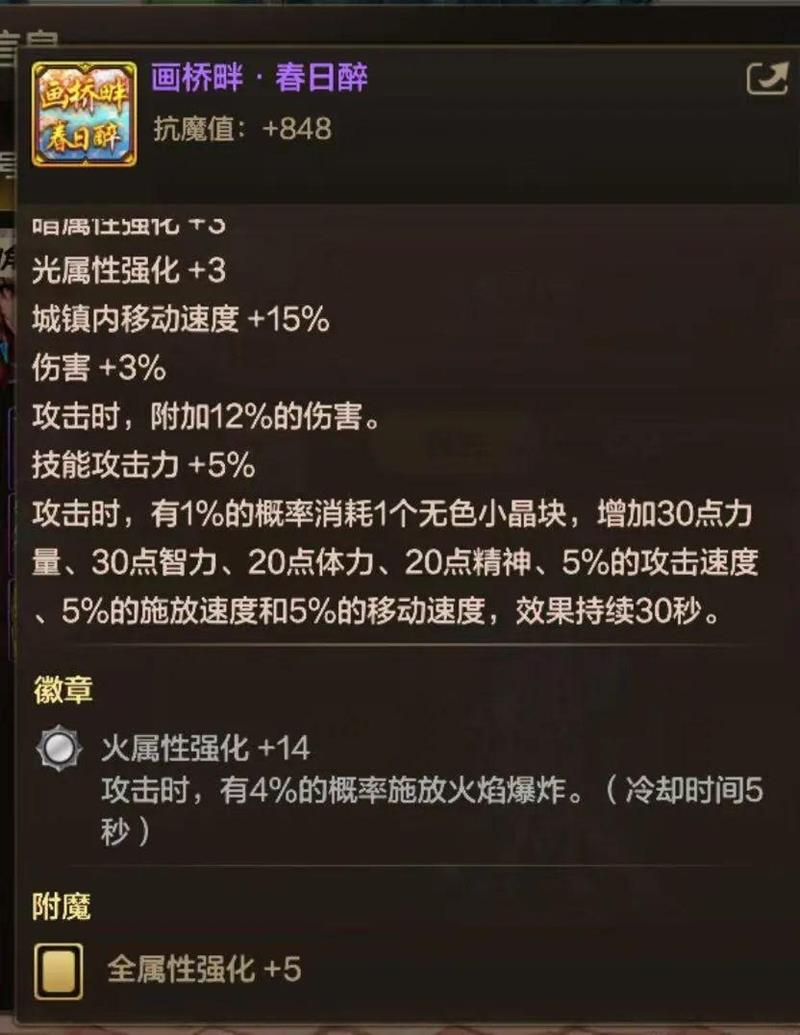 称号选择至尊称号,附魔属强+5的宝珠,能有效提升伤害。属强徽章达到5+6,属强值高达202,这在零氪玩家中属于顶级水平。