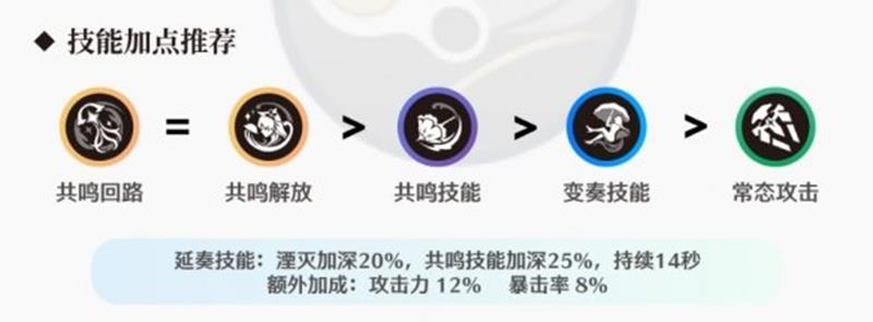 在技能加点方面,优先级为共鸣回路=共鸣解放>共鸣技能>变奏技能>常态攻击。