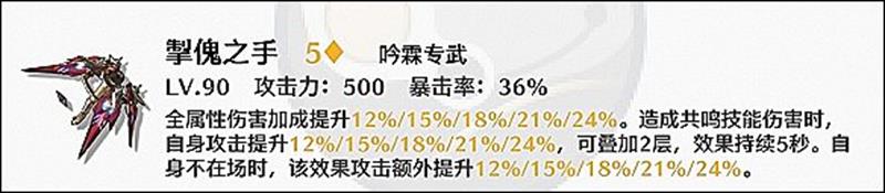 【掣傀之手】提供全属性伤害加成,造成共鸣技能伤害后自身攻击提升,若角色不在场则攻击额外提升;