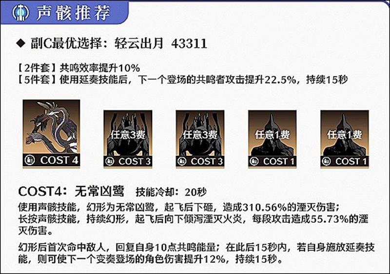 声骸推荐轻云出月43311搭配,COST4选择无常凶鹭,声骸主词条COST4优先暴击率加成或暴击伤害加成,COST3可选2湮灭属性加成或1共鸣效率加1湮灭属性加成,COST1则选择2攻击力加成。