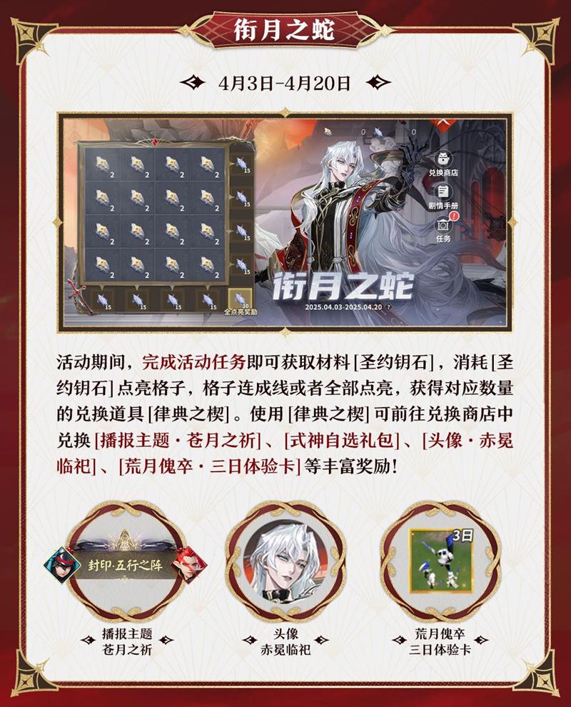 在活动方面,4月3日至4月17日期间,将开启“衔月之蛇”活动,阴阳师们完成活动任务可获取“圣约钥石”,消耗该材料点亮格子,有机会兑换“播报主题·苍月之祈”“式神自选礼包”“荒月傀卒·三日体验卡”等丰富奖励。
