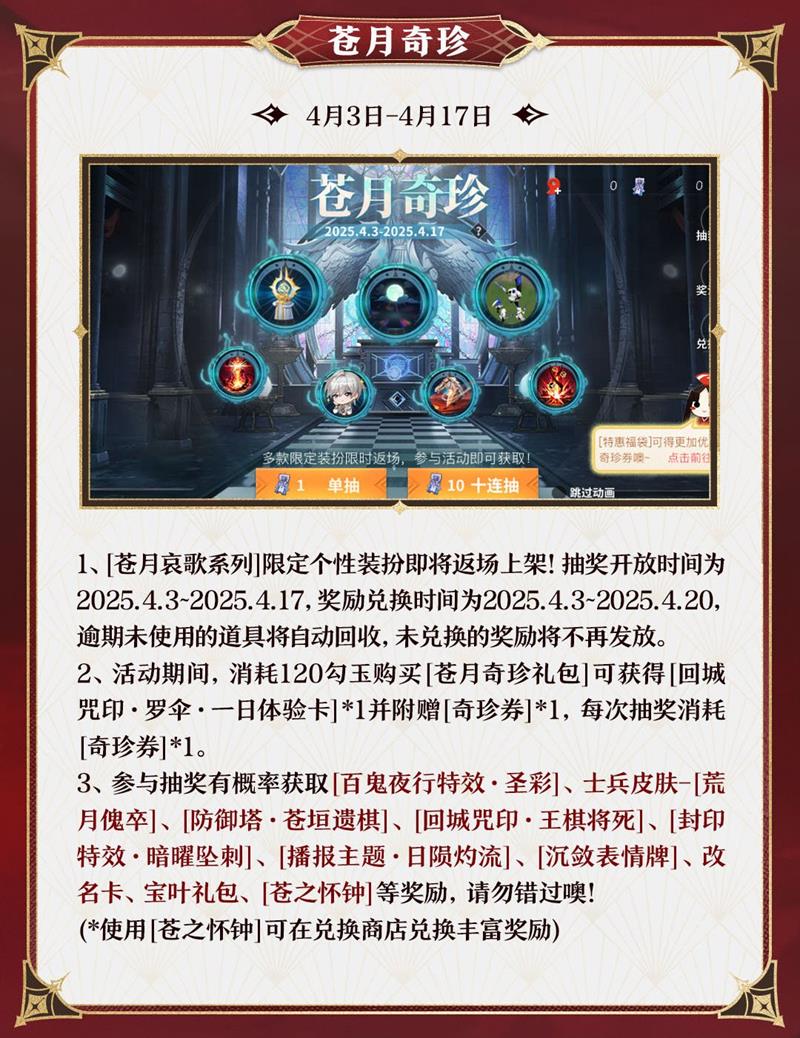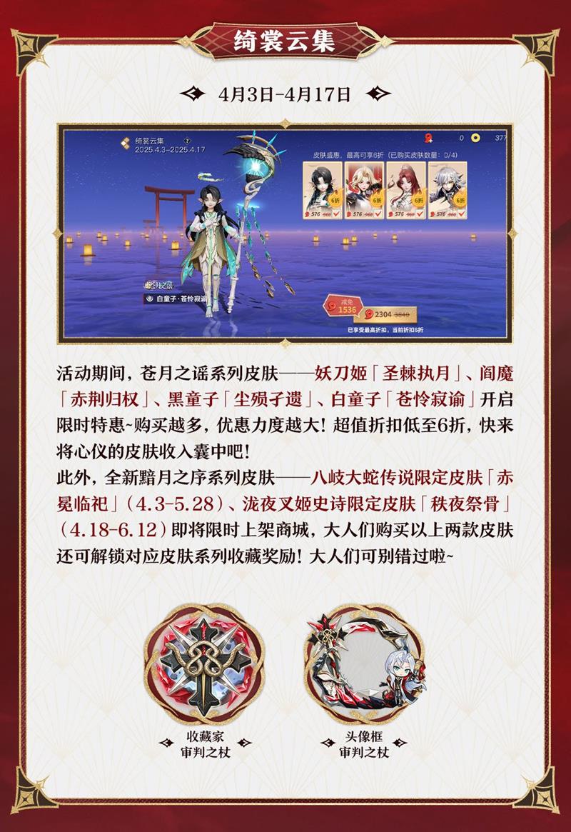 同一时间段内,“苍月奇珍”活动也将上线,[苍月哀歌系列]限定个性装扮再次登场,参与活动可获得永久“百鬼夜行特效·圣彩”“防御塔·苍垣遗棋”“士兵皮肤·苍月傀卒”等奖励。此外,参与“特惠福袋”活动,还能免费领取或以优惠价购买大量“奇珍券”。而“绮裳云集”活动则为妖刀姬、阎魔、黑童子、白童子的苍月之谣系列皮肤开启限时特惠,购买越多优惠力度越大,折扣低至6折。