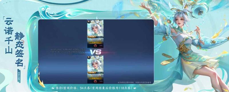 首周(4月3日-4月9日)一诺云诺千山动态签名优惠价286点券,静态签名优惠价94点券,4月10日起一诺云诺千山动态签名售价358点券,静态签名售价118点券。