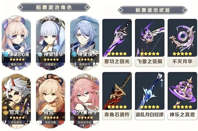 目前稻妻的角色包括雷电将军、八重神子、神里绫华、神里绫人、宵宫、荒泷一斗、万叶、心海以及5.4版本刚刚登场的梦见月瑞希。即便稻妻混池开启,雷电将军大概率会像钟离、温迪一样不入池,而万叶这种人权卡也大概率不会入池。