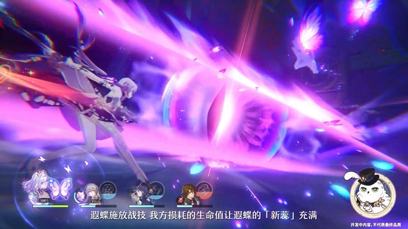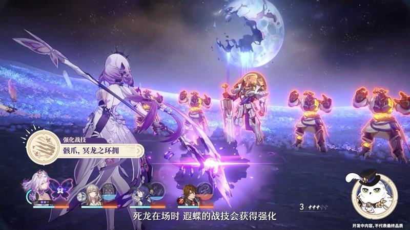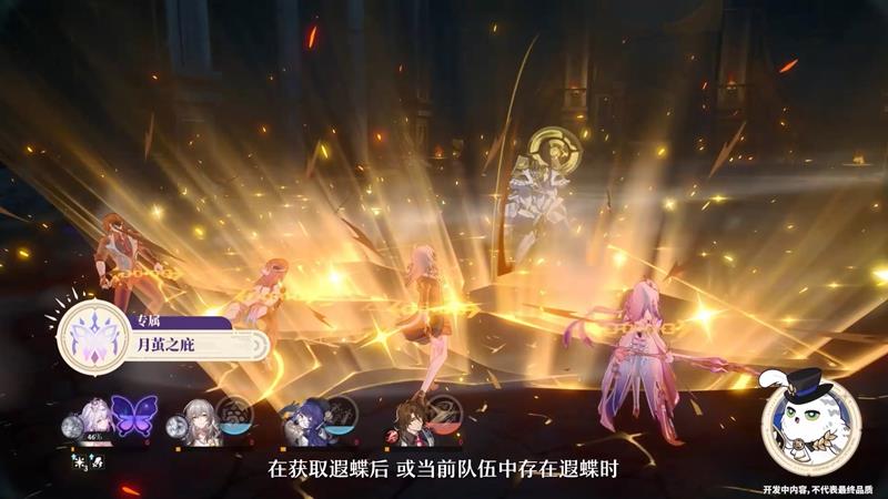 【月萤之庇】提供强大生存保障,受致命攻击时触发“月茧”状态,角色可正常行动1次,通过治疗或生命提升解除状态,否则行动后陷入无法战斗。死龙在场时遐蝶不获新蕊,但全队生命损失可转化为死龙生命值,解锁行迹后治疗也能回复死龙生命,这种转化机制让资源利用更加灵活。