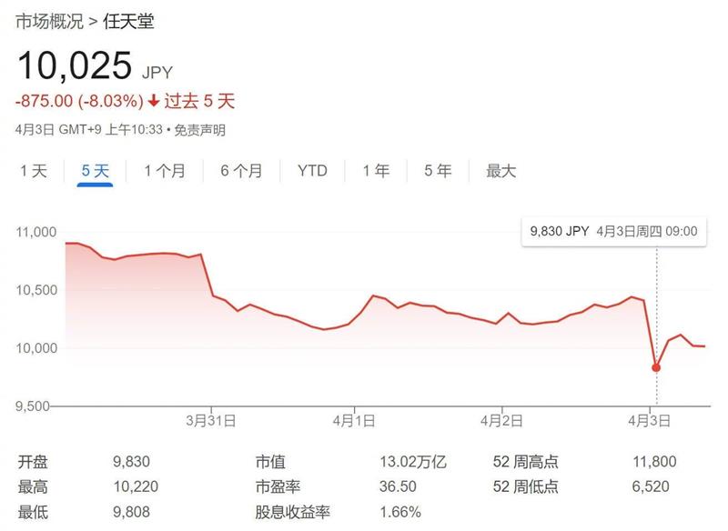 4月2日收盘时,任天堂股价为10410日元,到了4月3日开盘后,股价跌至9830日元,跌幅超过3%。