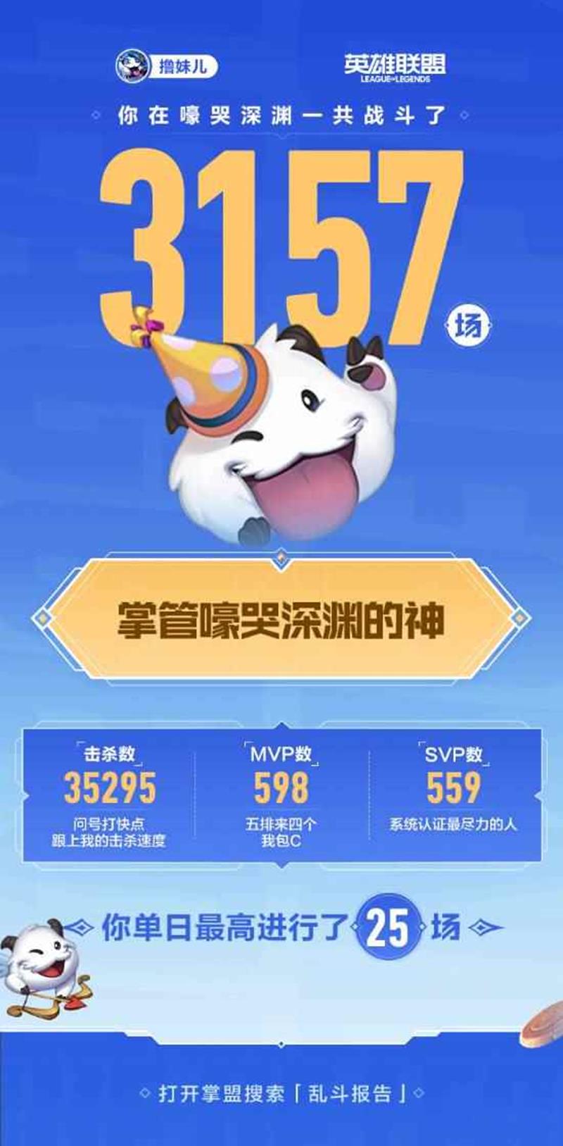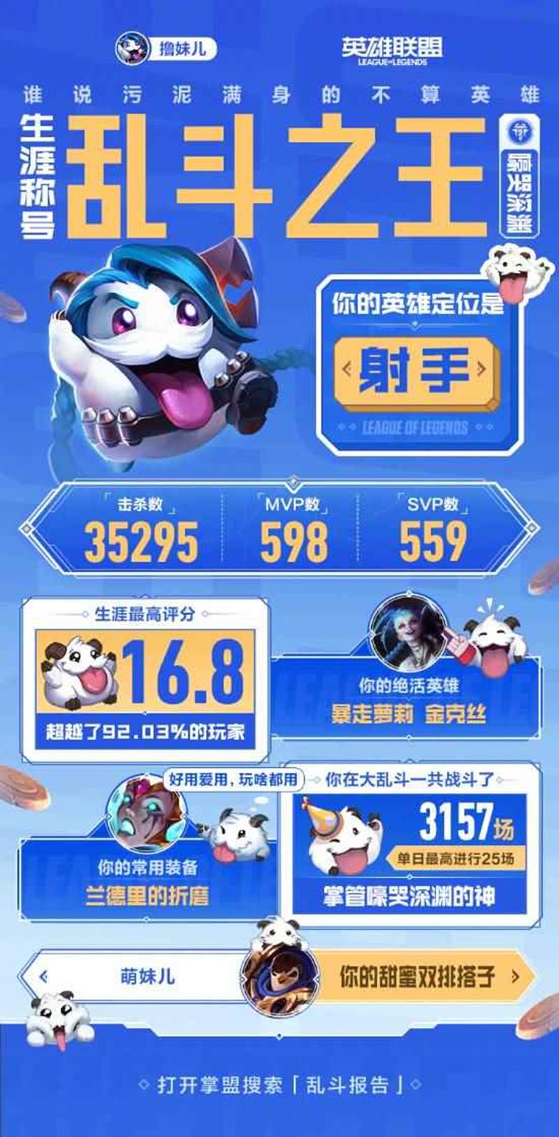 通过掌盟或客户端查询:玩家可以登录掌盟的活动中心或客户端的大乱斗联盟页面,点击“解锁你的专属报告”按钮,即可查看自己的大乱斗生涯报告。