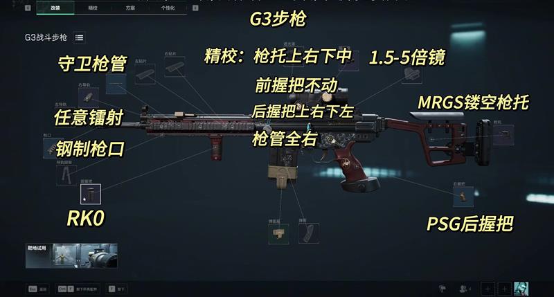 三角洲行动的G3战斗步枪改枪挺省钱的,属于性价比神器。拥有65米的优势射程,只能说是中远距离的神枪。近距离嘛——这个就随缘了。G3的话主要针对控枪手感进行改装,使用了MRGS镂空枪托、PSG后握把、守卫枪管来控制武器的后坐。