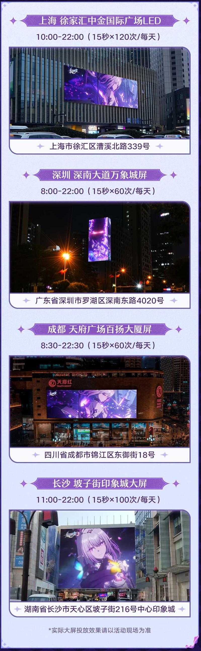 - 深圳:深南大道万象城屏(8:00-22:00,15秒×60次/每天)——广东省深圳市罗湖区深南东路4020号