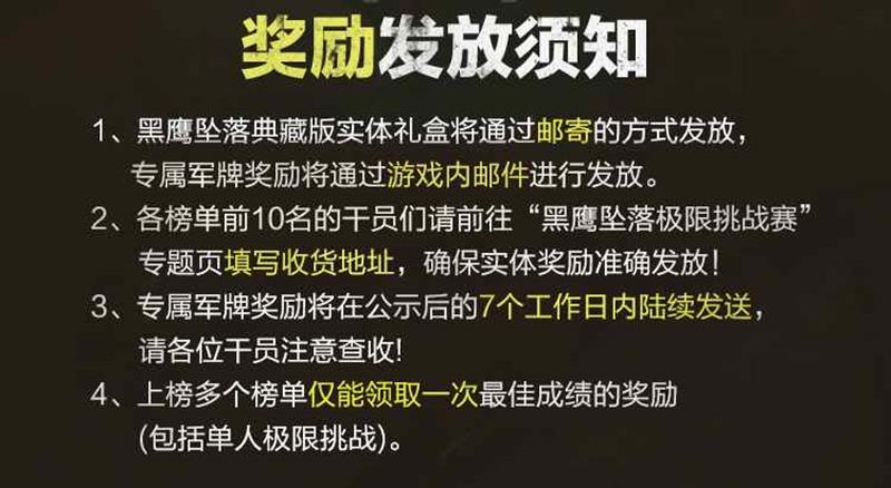 为了确保每位获奖干员都有充足的时间填写地址以便顺利收取奖励,官方特别将填写地址的奖励登记时间延长至4月30日。因此,各榜单前10名的干员需要前往“黑鹰坠落极限挑战赛”专题页填写准确的收货地址,以确保奖励能够准确无误地发放到手中。